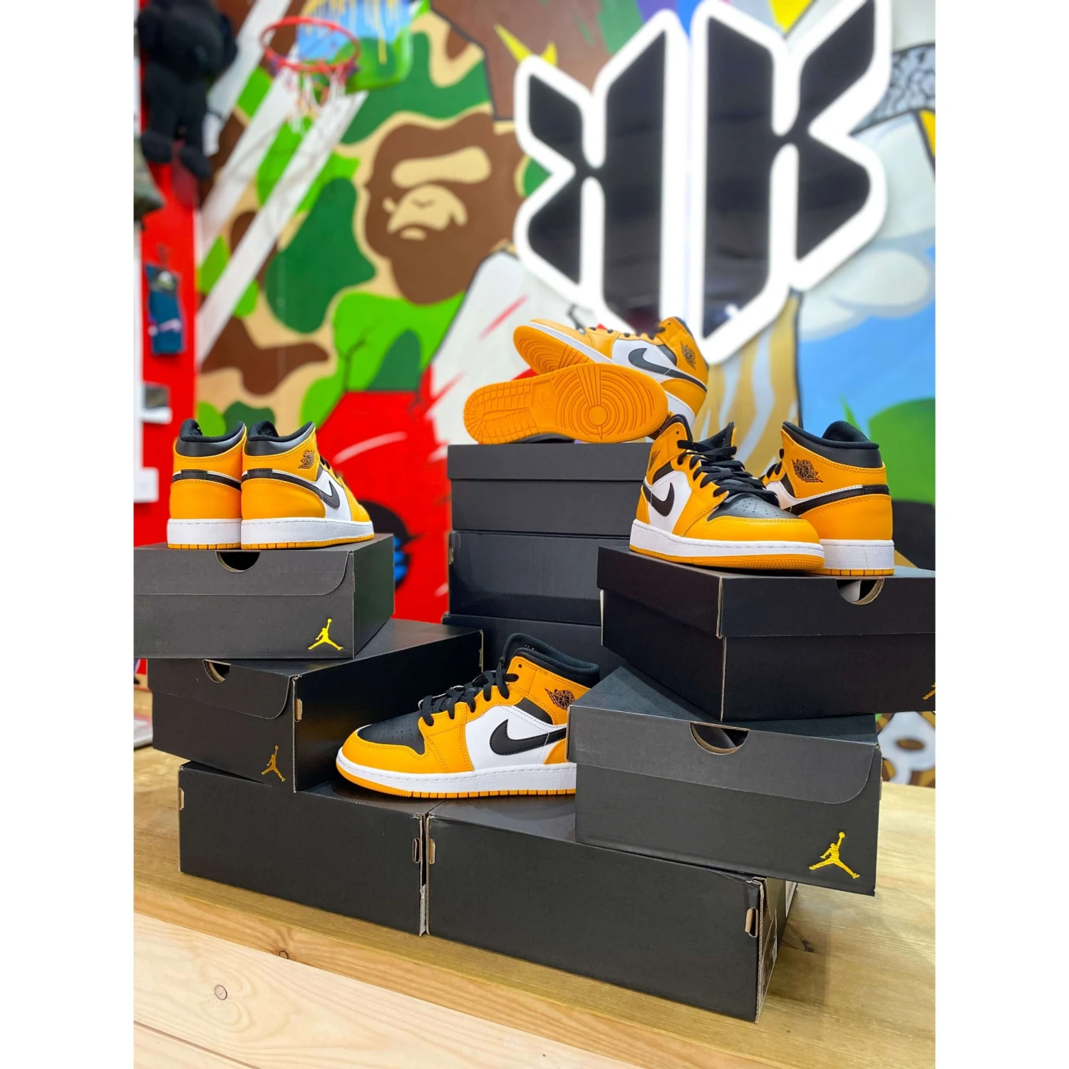 Released alongside the Jordan 1 High Yellow Toe, the Jordan 1 Mid Taxi has adopted a similar colour scheme to the iconic yellow taxis in NYC. The majority of the panels come in a yellow and black mix with a white side panel and white midsole to add some contrast to the sneaker. The shoe boasts the usual branding with a black swoosh and a yellow tag with a stitched-on Jumpman on the tongue.