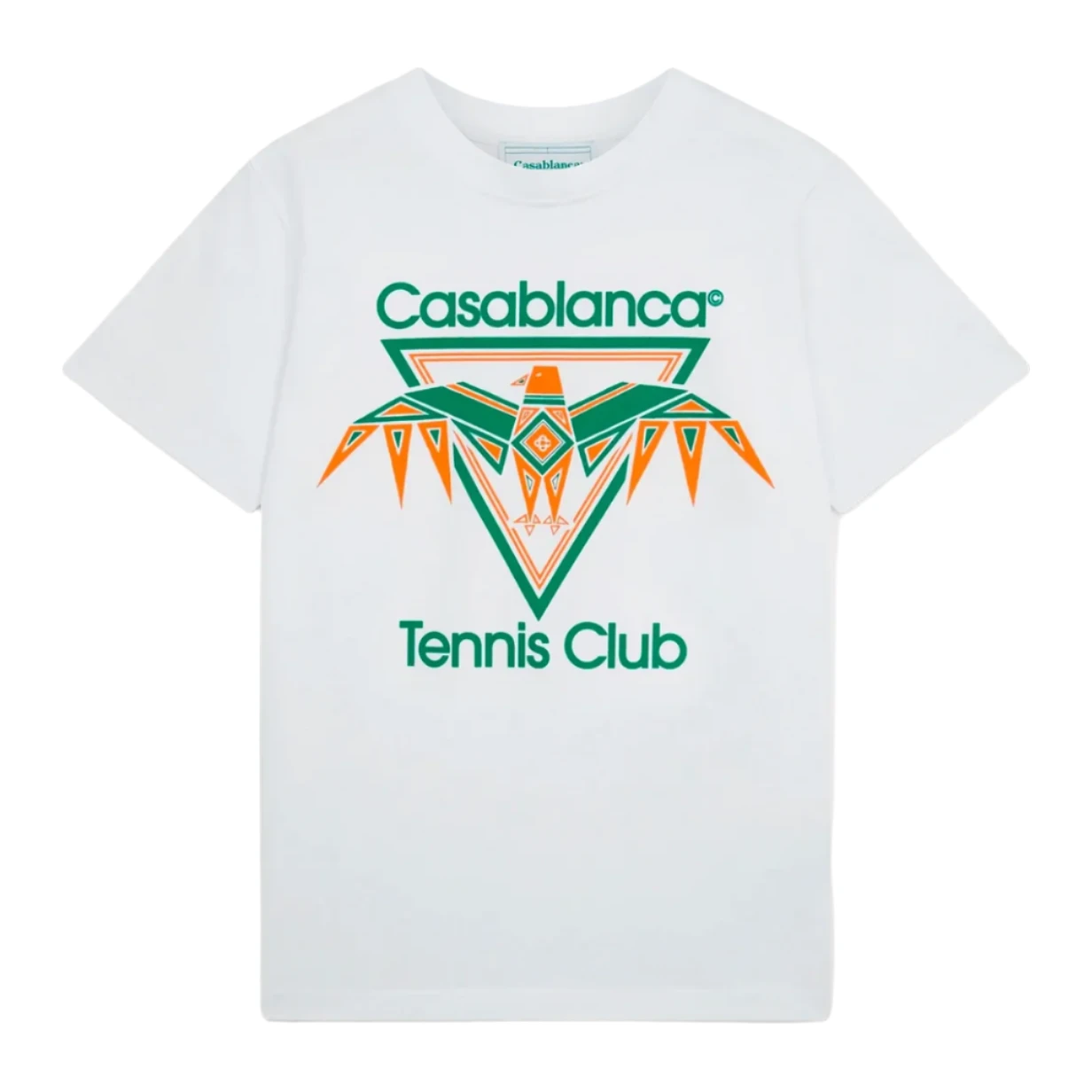 The Casablanca Playful Eagle T-Shirt in White is crafted from 100% organic cotton, featuring a ribbed crewneck and a relaxed fit. The front showcases a vibrant eagle graphic, symbolizing Nigeria, along with “Tennis Club” lettering, reflecting Casablanca’s fusion of cultural and sporting themes. Made in Portugal, this unisex T-shirt exemplifies the brand’s commitment to quality and artistic design.