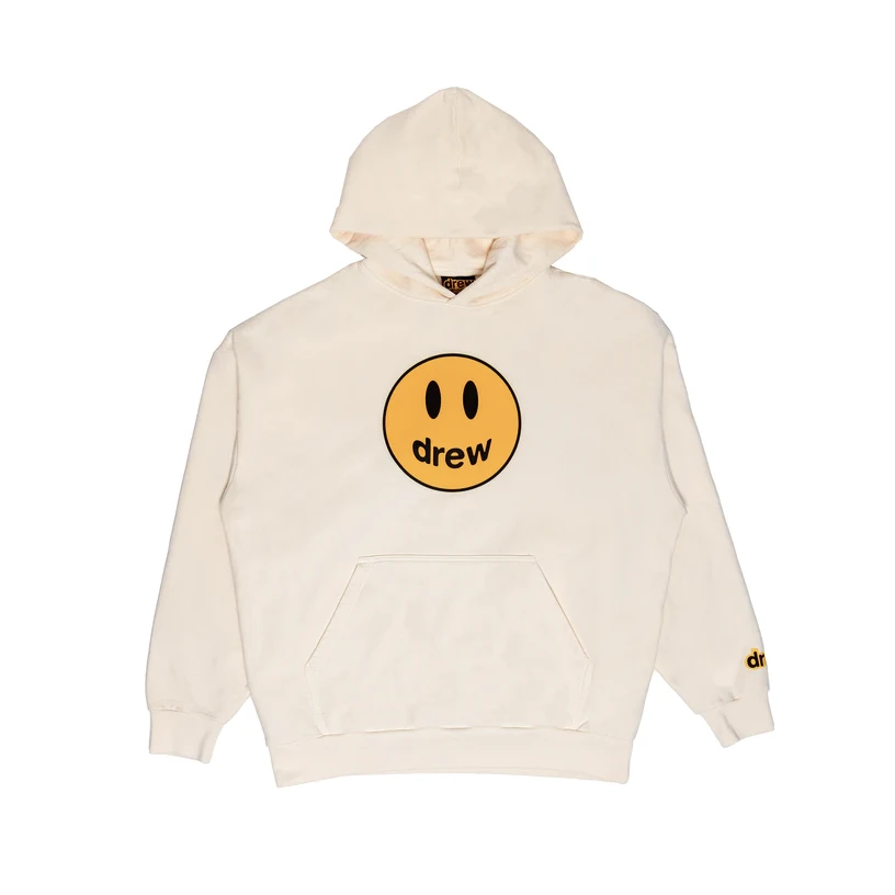 Introducing the Drew House Mascot Hoodie in Cream, a must-have piece from the highly sought-after collaboration between music superstar Justin Bieber and former stylist Ryan Good. This iconic hoodie showcases the unique and distinct branding that has become synonymous with the Drew House brand. The smiley face logo, with the word “Drew” forming the smile, is prominently featured on the front of the hoodie, making a bold statement.