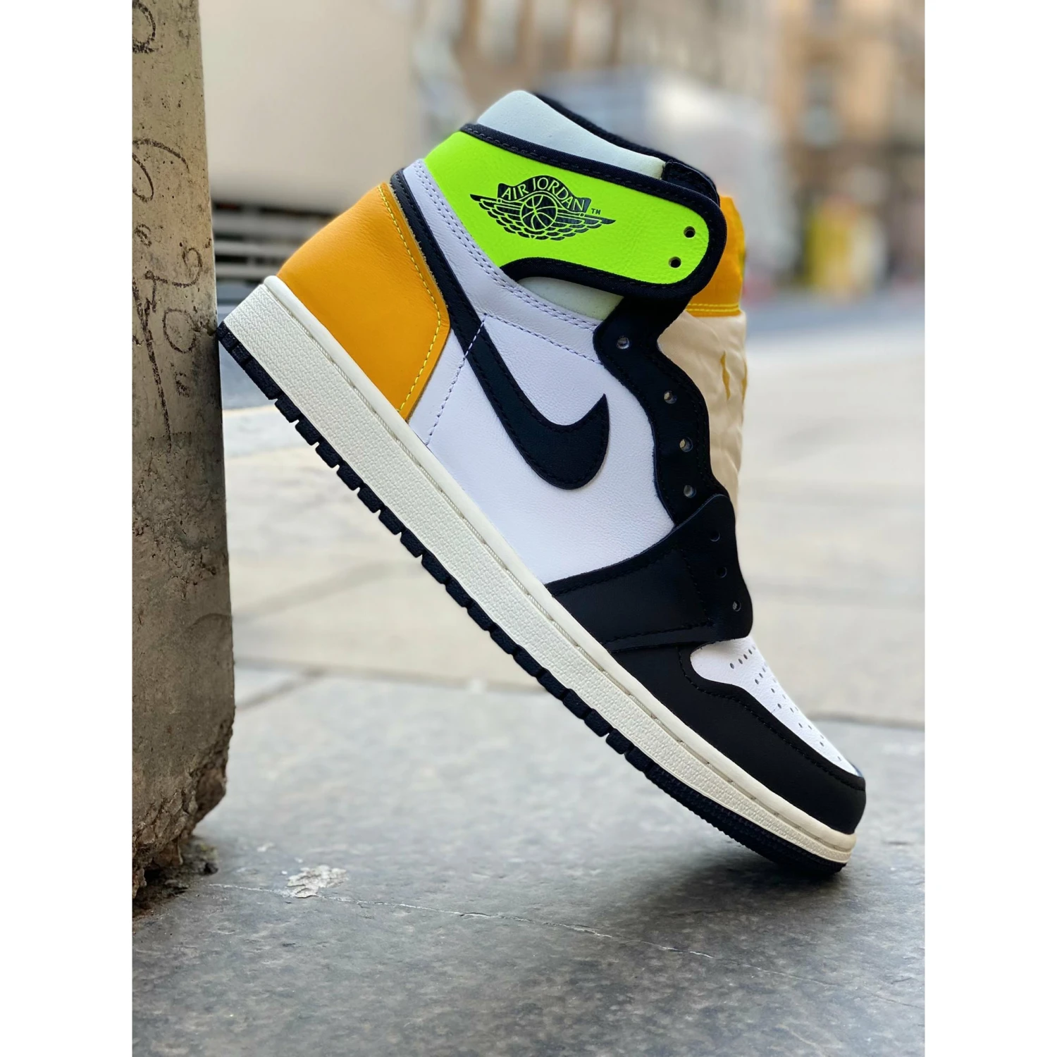 Features Black Toe colour with the upper comprising white, black, and yellow leather. A Volt yellow-tinted panel highlighting the Jordan Wings logo features on the ankle. The Volt Gold utilizes single stitch reinforcement on its overlays, . A nylon tongue with exposed foam edges and reverse transparent tongue and a yellowed midsole and black outsole offer a unique look.