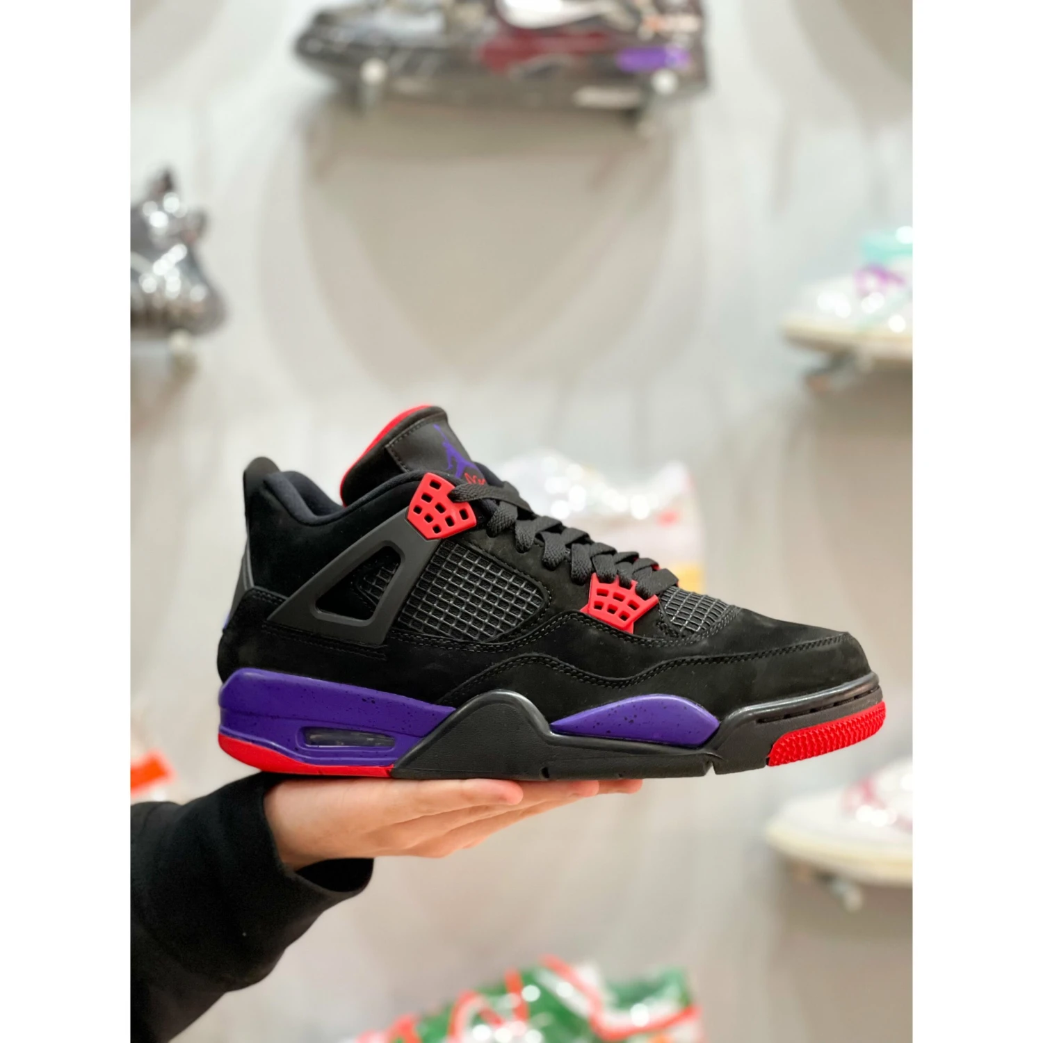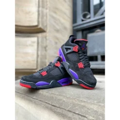 The Jordan 4 Retro Raptors (2018) is a highly sought-after release that draws inspiration from the original Air Jordan 7 of the same name. Constructed from nubuck, just like the 1992 release, this sneaker features a striking black, red, and purple color palette. However, it deviates from the original Jordan 7 by swapping out the charcoal grey paneling and adding a speckled midsole for a fresh twist.
