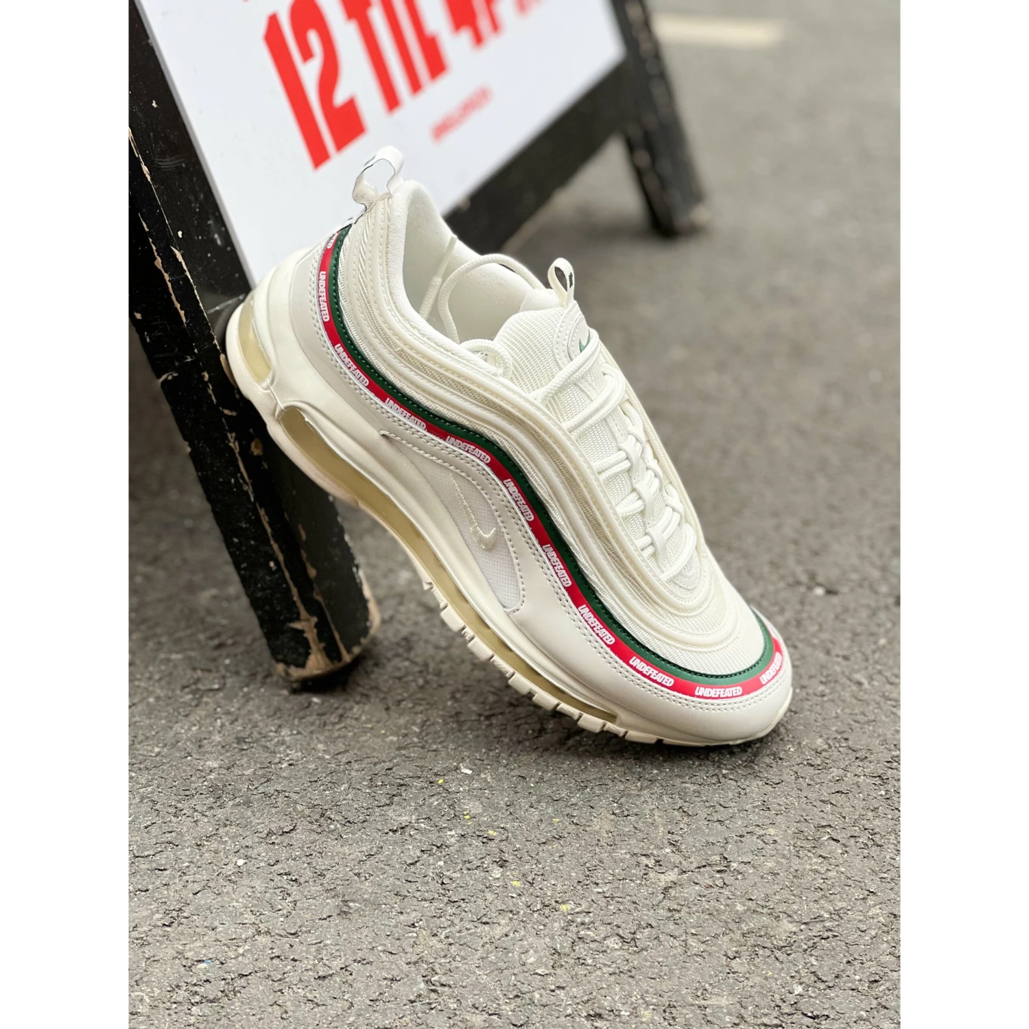 Perhaps one of the most anticipated releases of the year, the Nike Air Max 97 UNDFTD White is a collaboration between Nike and UNDEFEATED that resulted in a sleek and stylish sneaker. The design keeps things subtle, with a clean white colorway and minimal branding. The standout detail is the green and red stripe that wraps around the shoe, reminiscent of the classic Gucci colors. This adds a touch of luxury and sophistication to the overall design. Made with a combination of high-quality materials, including a durable upper and a comfortable sole, these sneakers are built to last. Whether you’re hitting the streets or just looking for a stylish everyday shoe, the Nike Air Max 97 UNDFTD White is a must-have addition to your sneaker collection. With its timeless design and attention to detail, it’s sure to turn heads wherever you go.