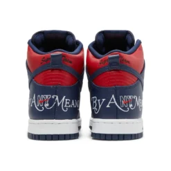 Introducing the Nike SB Dunk High Supreme By Any Means Navy, a sneaker that combines style and functionality in one stunning package. This highly anticipated release is part of a trio that is sure to turn heads and make a statement. The shoe features a navy and red leather upper that is both eye-catching and sophisticated. But it’s the details that really set this sneaker apart. Embroidery across the heel and sidewall showcases the words ‘By Any Means’ and ‘No’ with a red heart next to it, adding a touch of rebelliousness and individuality.