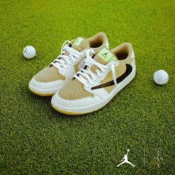 The Travis Scott Air Jordan 1 Golf is a fusion of basketball and golf footwear. While maintaining the classic upper construction of the iconic 1985 basketball shoe, it introduces a modified outsole tailored for the golf course. This outsole stands out with its thicker grooves, designed to provide superior grip on golf course terrain. What sets it apart is the spikeless design, functioning like a conventional outsole but featuring a robust rubber compound for enhanced durability. Notably, this collaboration earns distinction as the first golf shoe to bear the coveted Cactus Jack endorsement. This color palette showcases an olive-brown suede foundation complemented by pristine white leather overlays. Black Reverse Swooshes grace the shoe’s sides, while the tongue is accented with sail white, featuring labels for Jumpman Golf and Cactus Jack. A white midsole and an olive rubber outsole round off the design transformation of the Air Jordan 1 Low.
